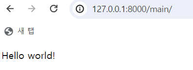 지정했던 경로인 "127.0.0.1:8000/main/"에 올바르게 "Hello world!"가 출력된 것을 확인할 수 있다.